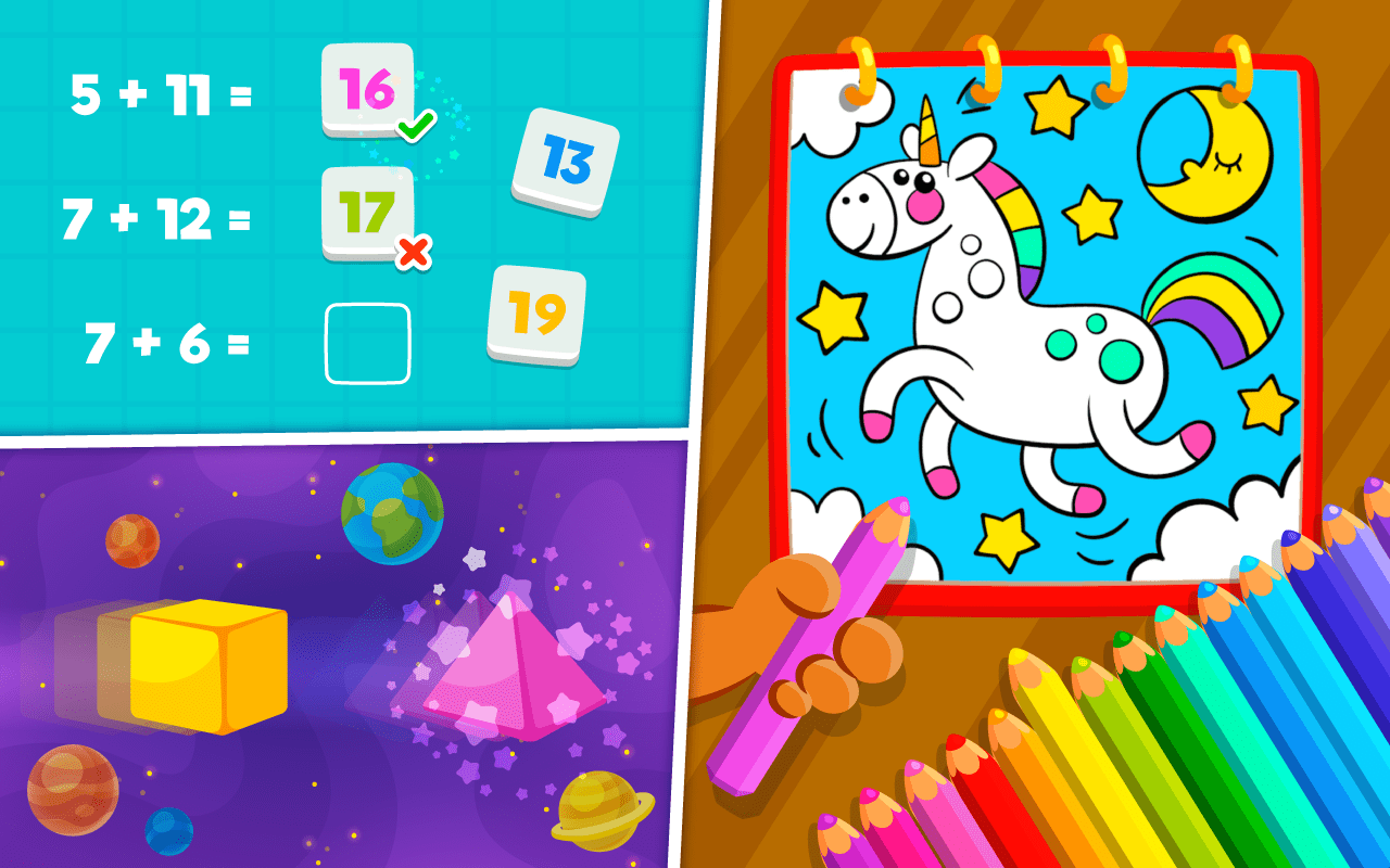 Let's do some brain training. You can play with geometric shapes or learn about addition, subtraction, multiplication and division at the difficulty level of your choice. Learn some basic English words or train your writing to master the alphabet.